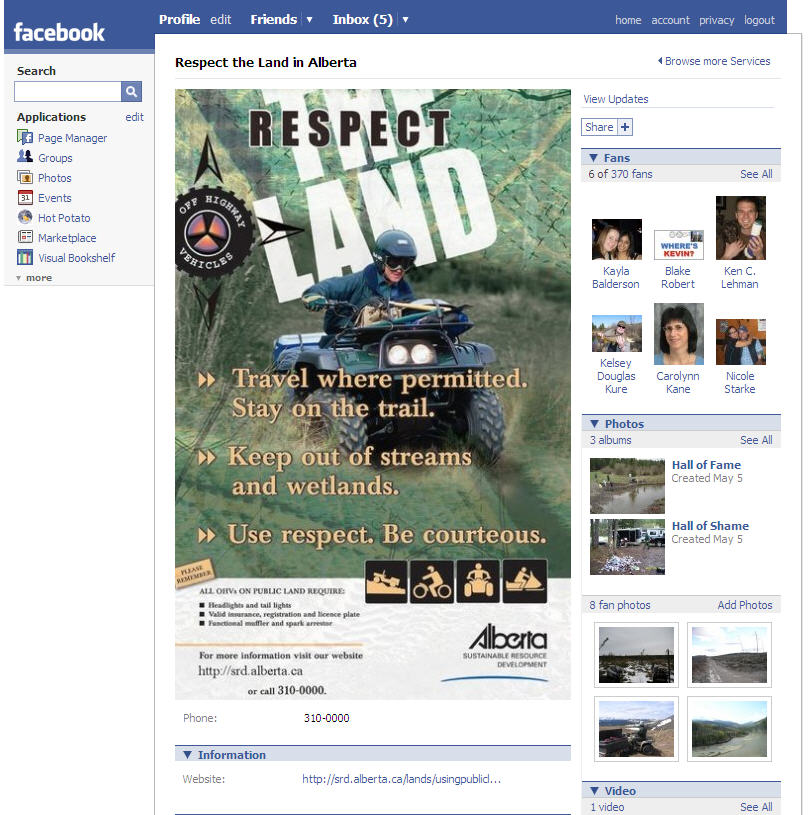 The Alberta government has a Facebook page aimed at out-door users. Called ‘respect the land’ it is from the ministry of Sustainable Resources and may be one of the first of its kind. Is the government getting ‘with-it’? and recognizing that more and more people are using social networking and social media for their news and information gathering? Are you?